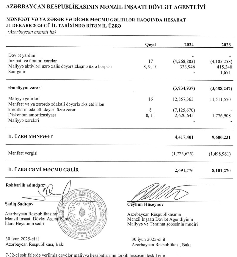 Marja.az qurumun 31 dekabr 2024-cü il tarixində bitən il üzrə maliyyə hesabatlarına istinadən xəbər verir ki, ötən il Mənzil İnşaatı Dövlət Agentliyinin maliyyə gəlirləri 1 milyon 346 min manat və ya 11,7% artaraq 12 milyon 857 min manat təşkil edib. Həmçinin, Agentlik "Maliyyə aktivləri üzrə xalis dəyərsizləşmə üzrə bərpası" hesabı üzrə 334 min manat, "Diskontun amortizasiyası" hesabı üzrə 2 milyon 621 min manat gəlir əldə edib.